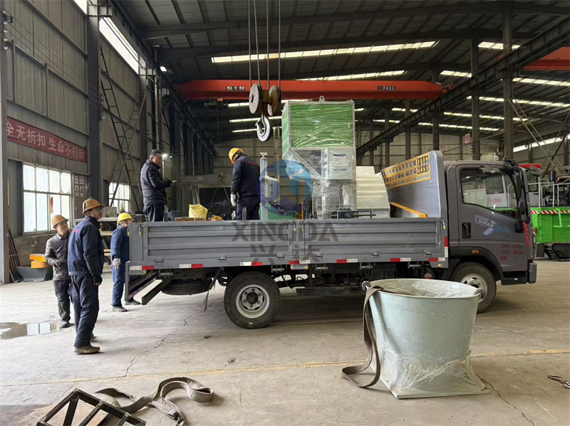 发货绥化:有机肥设备自动包装机、木材粉碎机正在车间进行装车